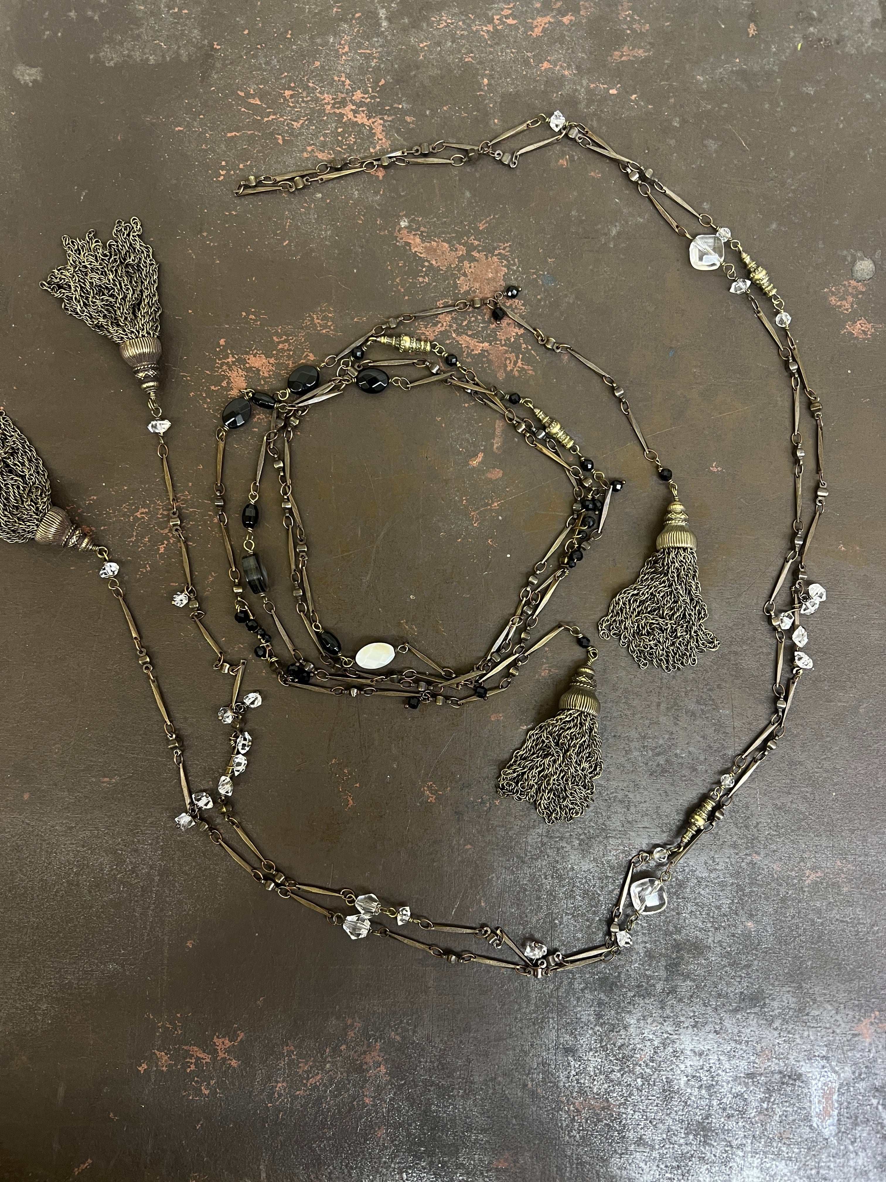 “tree of life = 生命の樹” をイメージしたシリーズより、一点物のネックレスが誕生しました。 美しい水晶結晶の原石を、優しく包み込むかのようにセッティングされたトップ。 石座は裏にまで木のモチーフになっていますので、とても神秘的で存在感のあるネックレスに仕上がりました。 石に合わせていくつか製作しましたが、どれもそれぞれに雰囲気があり、唯一無二の一点物のネックレスとなります。 チェーンはどこでもお留めいただける仕様になっておりますので、お洋服に合わせてコーディネートをお楽しみください。 [全長] 約 60cm(最長65cm調節可能) [トップサイズ] 縦約 2.2cm× 横約 1.8cm(最大部) [素材] 水晶結晶原石×グリーンオプシディアン×真鍮古美