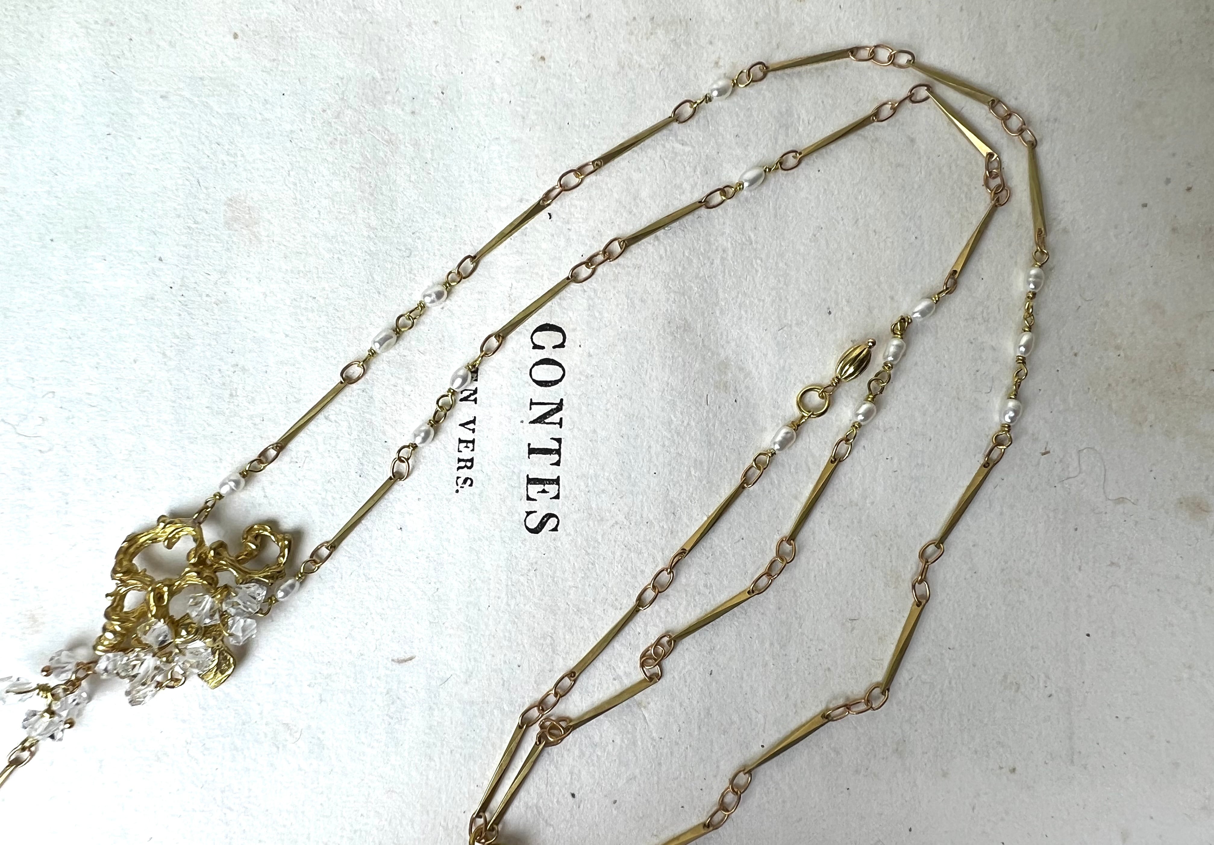 チェーンの間には淡水パールが紡がれており、胸元で優しく輝くハーキマーダイヤモンドが上品に存在感を放つデザインとなっております。