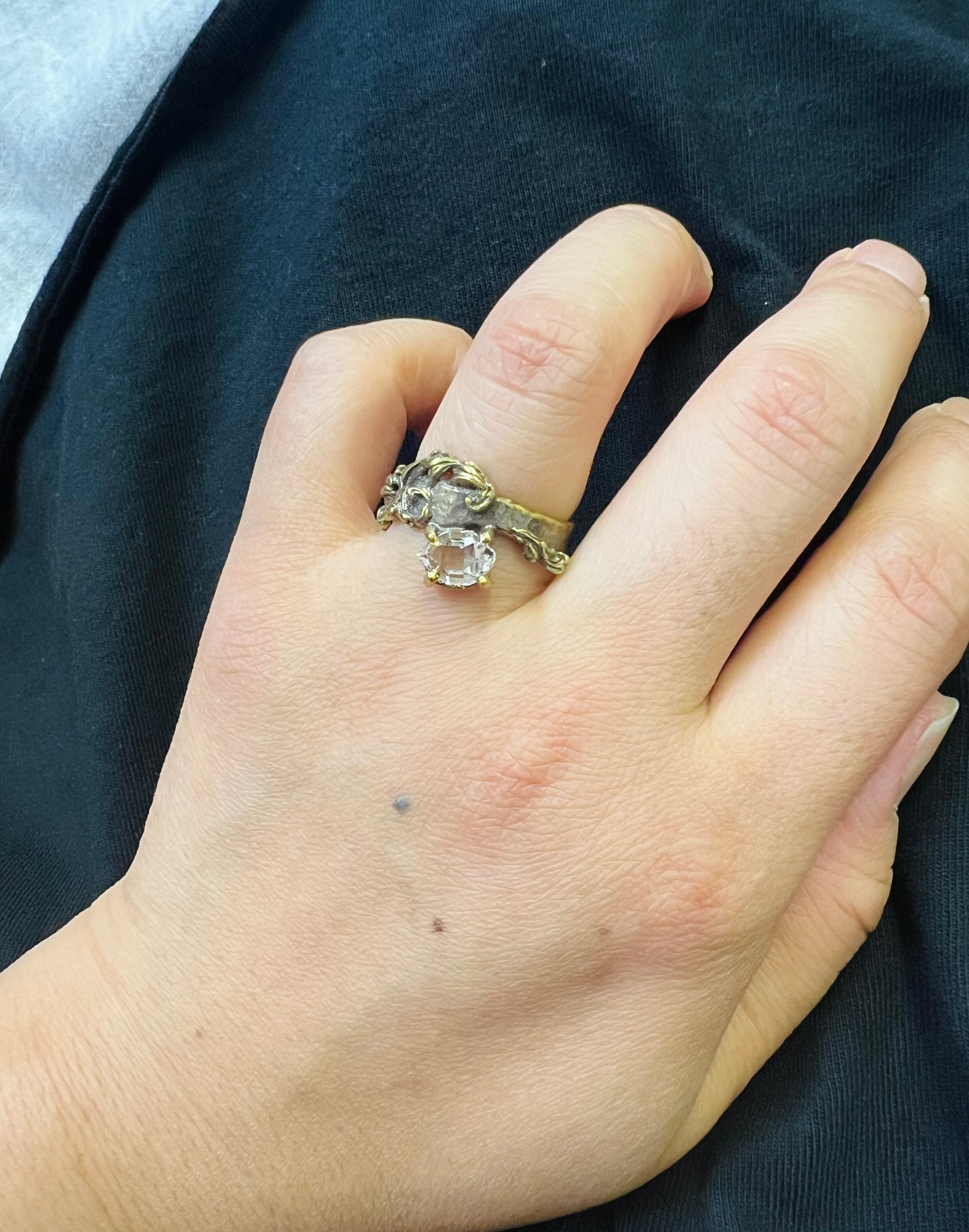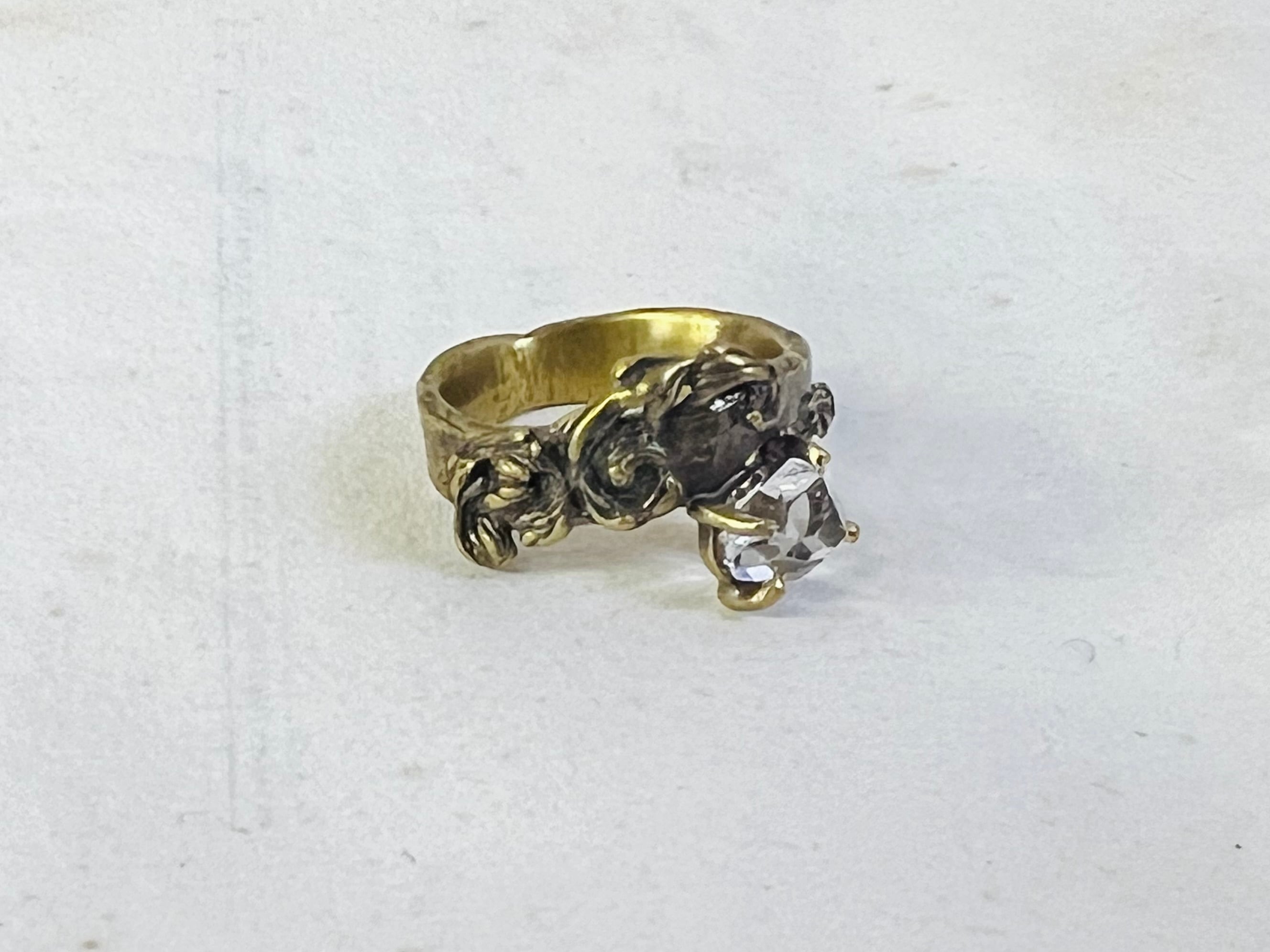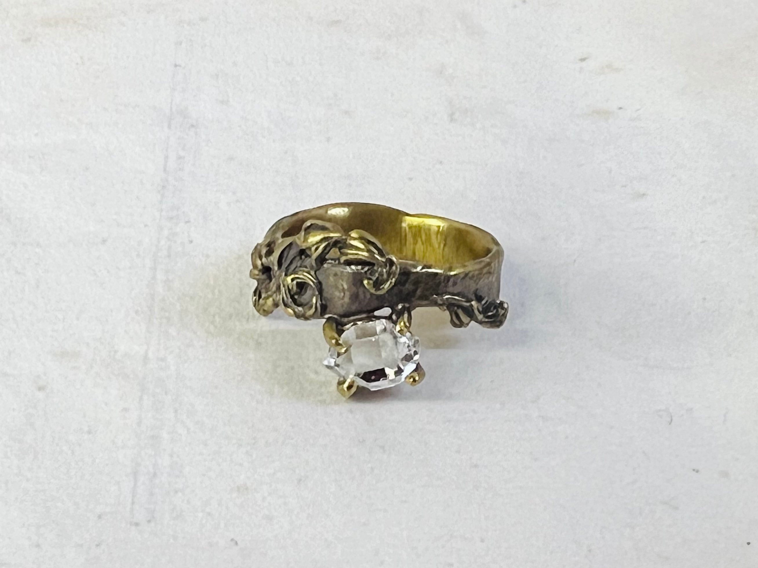 無骨な雰囲気のアラベスクモチーフのリングに、美しいハーキマーダイヤモンドをセッティングしました。